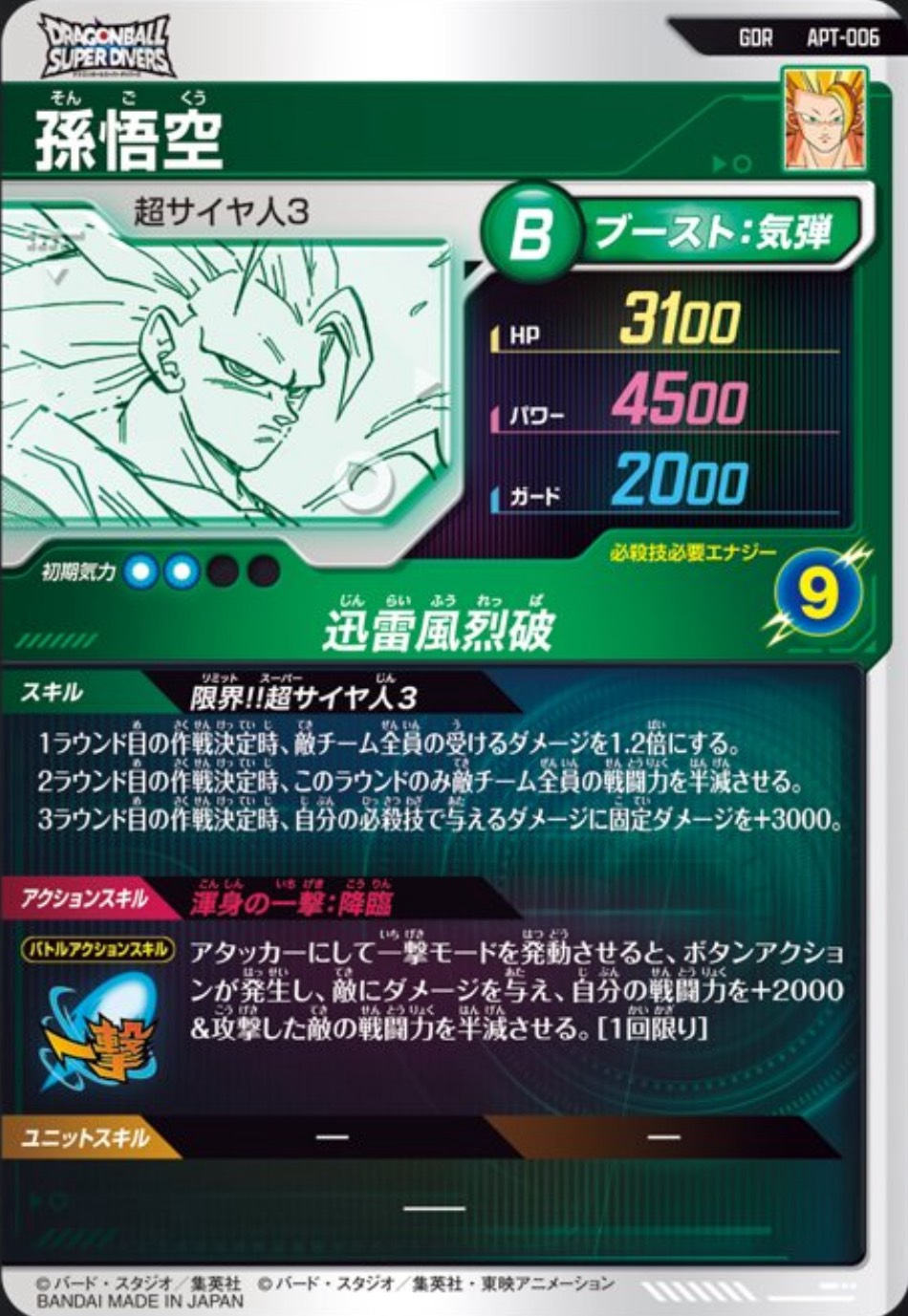 アタッカーにして戦闘力バトルに勝つと、自分のガードを+1500&自分の気力を全回復&このラウンドのみ自分は気力ダメージを受けない。[毎回]