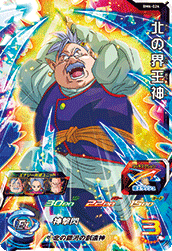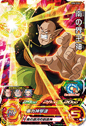 - バトル開始時、自分チーム全員のパワーとガードが永続で2倍になる。自分チームに「界王神」「西の界王神」「南の界王神」「北の界王神」が揃っていると、効果が超アップする。
