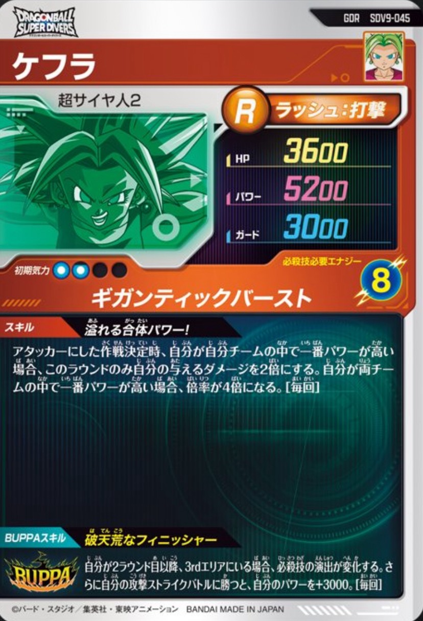 - ラウンド終了時、カードアクションに成功すると超サイヤ人に変身し、パワーを+2000&気力を少し回復する。[1回限り]