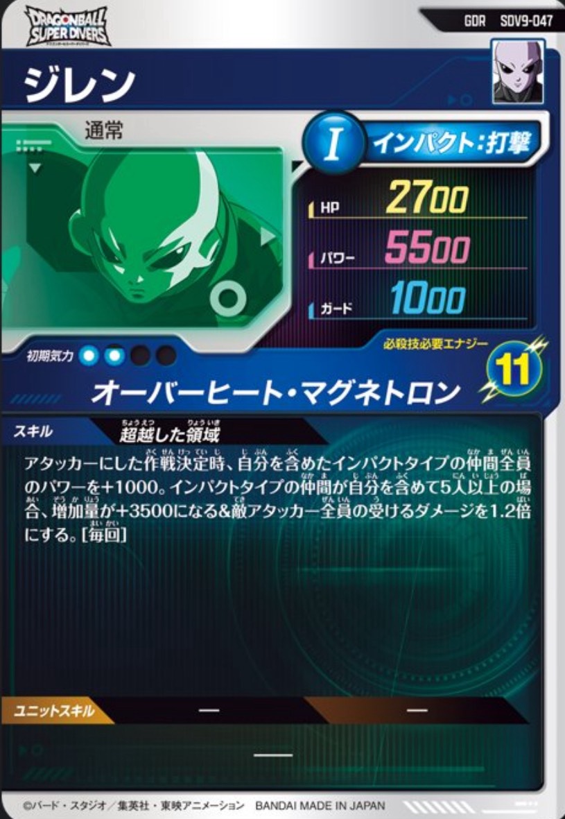 - 作戦決定時、自分がアタックゾーンにいる時、必殺技エナジーが7個以上あるエリアにいる仲間アタッカー全員のパワー+3000。自分がサポートゾーンにいる時は、仲間アタッカー全員のガードを+1500&気力ダメージ耐性を中アップする。[毎回]