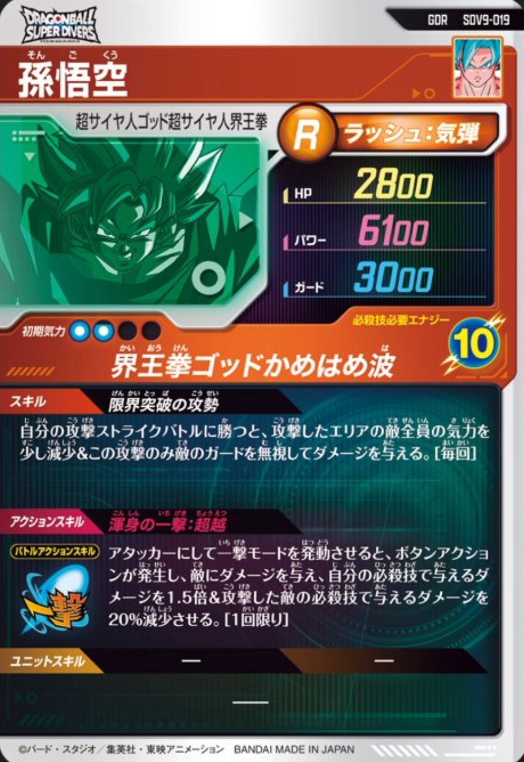 ラウンド終了時、カードアクションに成功すると超サイヤ人ゴッドに変身し、パワーを+4000&気力を少し回復する。[1回限り]